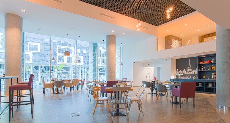 فندق بتصميم بسيط يضم غرفًا مريحة ومطعمًا واسعًا وبارًا غنيًا بالألوان وناديًا رياضيًا